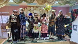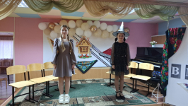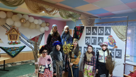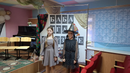 Учащиеся класса Сорудейкина Рая, Мишина Софья, Осипова София, Маскайкина Ульяна, Куликова Дарья,Степушкина Арина и Тявкина Вера подготовили замечательные костюмы " Бабок Ёжек", продемонстрировали их под аплодисменты зрителей. И исполнили шуточные частушки из мульфильма " Летучий корабль". Еще Бабки Ежки подготовили интересные стихи о своем сказочном образе.