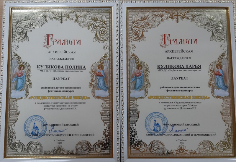 Состоялся очередной фестиваль-конкурс "Рождественская звезда".Куликова Полина и Куликова Дарья,класс преподавателя Долганиной Е.В. - участники Гала-концерта Лауреатов фестиваля "Рождественская звезда-2022". На фестивале исполнена музыкально- литературная композиция "Рождественская легенда".