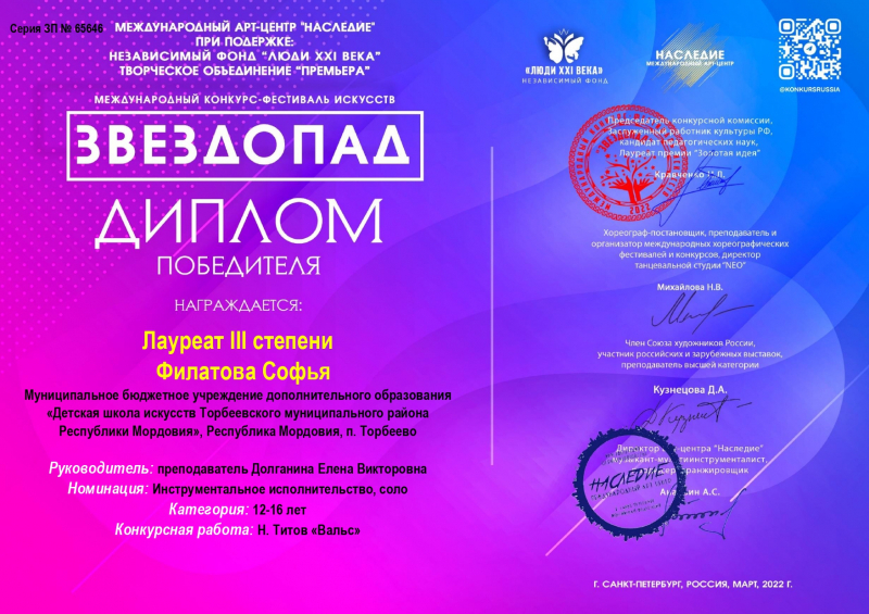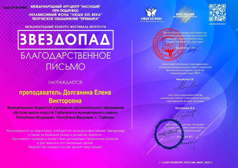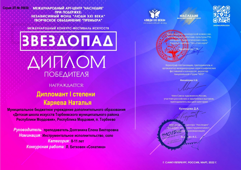 Подведены итоги Международного конкурса- фестиваля "Звездопад". В номинации инструментальное исполнительство от класса преподавателя Долганиной Е.В. приняли участие четверо обучающихся в подноминации "соло": Акашкина Полина, Куликова Полина ( 4 год обучения), Каряева Наталья( 3 год обучения) и Филатова Софья( 6 год обучения).Все девочки по итогам получили Дипломы Победителя. Преподавателем за каждую работу участниц получено Благодарственное письмо. Как преподаватель от души их поздравляю , желаю им дальнейших успехов! Хочется сказать также слова всемирно известного композитора Д.Д Шостаковича: "Благодаря музыке вы найдете в себе новые неведомые вам прежде силы. Вы увидите жизнь в новых тонах и красках".
