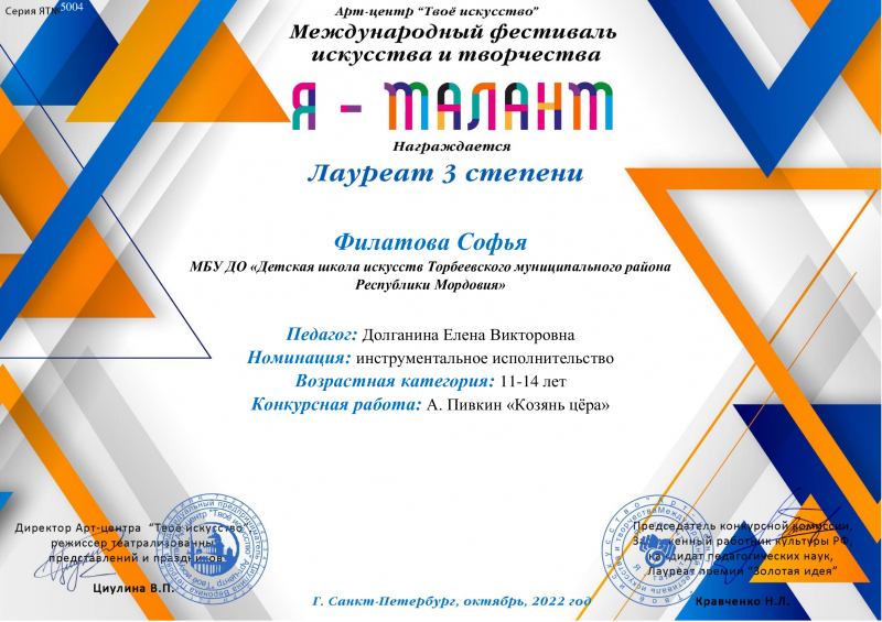 Участие в Международном фестивале искусства и творчества «Я-талант». 09 ноября 2022