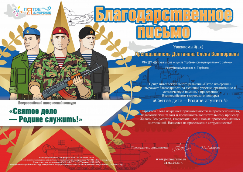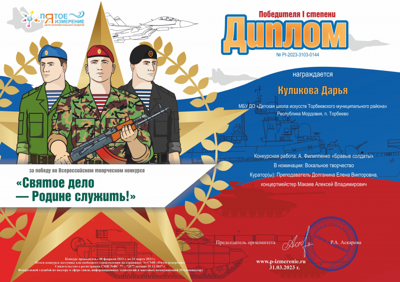 « Святое дело Родине служить!»(Республика Татарстан, г. Набережные Челны). И вот, наконец – то итоги подведены и пришел результат участия. Поздравляем Дашу с Победой – она награждена Дипломом Победителя I степени. Преподаватель Долганина Е.В. отмечена Благодарственным письмом и Сертификатом куратора организаторами конкурса.