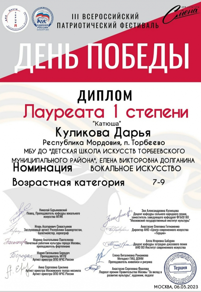 Состоялся III Всероссийский патриотический фестиваль"День Победы". Участие в котором рекомендовано Министерством культуры, национальной политики и архивного дела Республики Мордовия( письмо от 10.04.2023 года за номером 01-12/1317 за подписью Министра культуры, национальной политики и архивного дела С.Н.Баулиной).