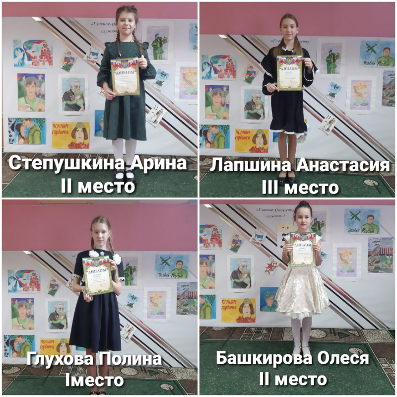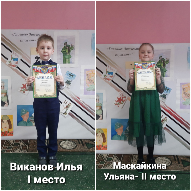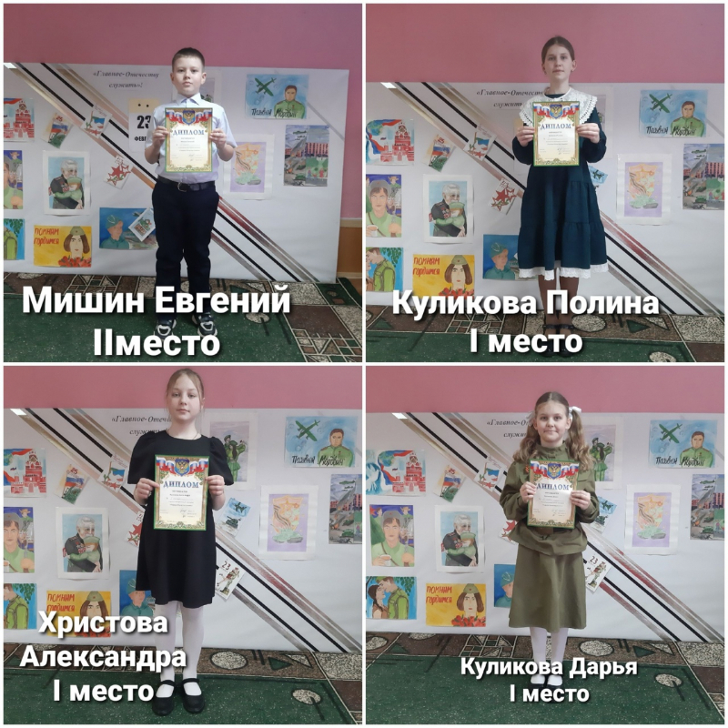 21 февраля,накануне праздника "День защитника Отечества", в нашей школе состоялся творческий фестиваль " Главное Отечеству служить!" От нашего класса приняли участие 10 учащихся в разеых вохрастных категоряих. Поздравляем наших учащихся с победными местами и получением Дипломов!(подробнее в фотоотчете).