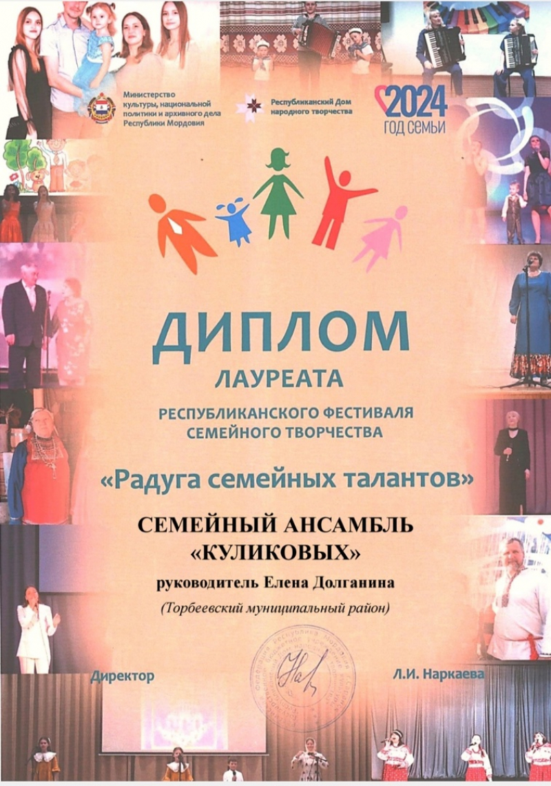 Состоялся Республиканский конкурс "Радуга семейных талантов". В нем приняла участие преподаватель Долганина Е.В. Вместе с семьей Куликовых был подготовлен творческий номер, который был включен в республиканский концерт. А также участники стали Лауреатами конкурса и получен диплом.