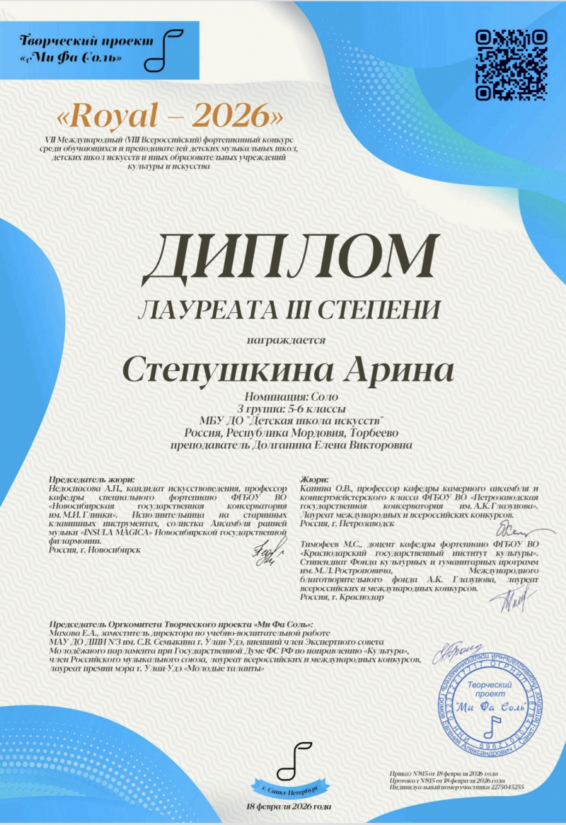 Подведены итоги VII Международного (VIII Всероссийского) фортепианного конкурса «Royal-2026» среди обучающихся и преподавателей детских музыкальных школ, детских школ искусств.Этот конкурс проводится ежегодно на мидийной платформе «Музыкальные конкурсы Ми,Фа,Соль».
